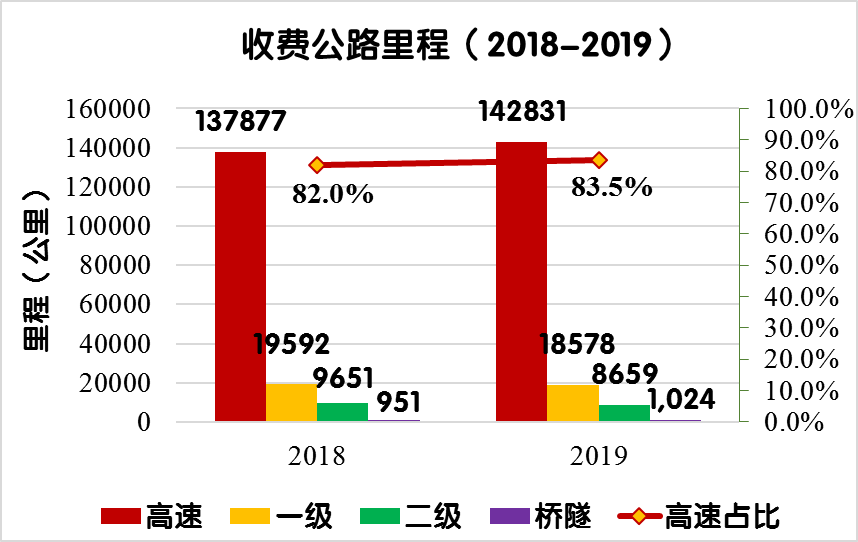 與上年末相比,全國收費公路總里程由168071公里增加到171093公里,凈增加3022公里,增長1.8%。其中,高速公路里程由137877公里增加到142831公里,凈增4954公里,增長3.6%;一級公路由19592公里減少到18578公里,凈減1014公里,下降5.2%;二級公路里程由9651公里減少到8659公里,凈減992公里,下降10.3%;獨立橋梁及隧道里程由951公里增加到1024公里,凈增73公里,增長7.7%。隨著高速公路里程不斷增長和普通收費公路逐步到期停止收費,全國收費公路結(jié)構(gòu)進(jìn)一步優(yōu)化。
