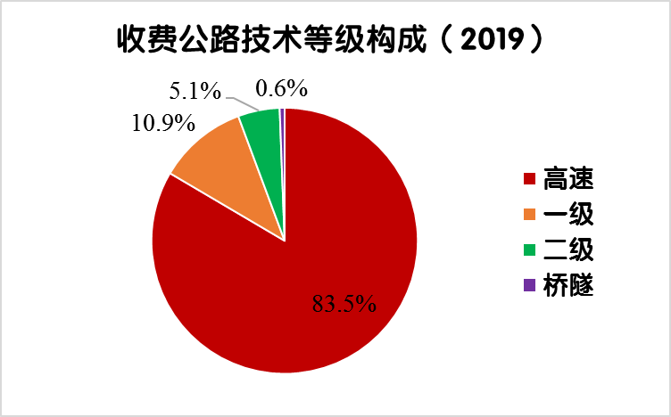 2019年末,全國收費公路里程17.11萬公里,占公路總里程501.25萬公里的3.4%。其中,高速公路14.28萬公里,一級公路1.86萬公里,二級公路0.87萬公里,獨立橋梁及隧道1024公里,占比分別為83.5%、10.9%、5.1%和0.6%。