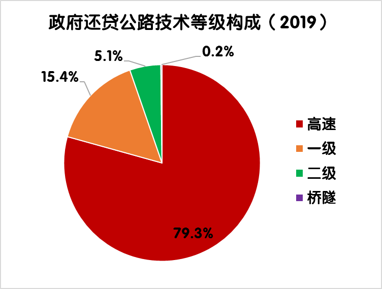 2019年末,全國政府還貸公路里程9.39萬公里,占全國收費公路里程的54.9%。其中,政府還貸高速公路7.45萬公里,一級公路1.44萬公里,二級公路0.48萬公里,獨立橋梁及隧道186公里,占比分別為79.3%、15.4%、5.1%和0.2%。政府還貸高速公路占收費高速公路里程的52.1%。