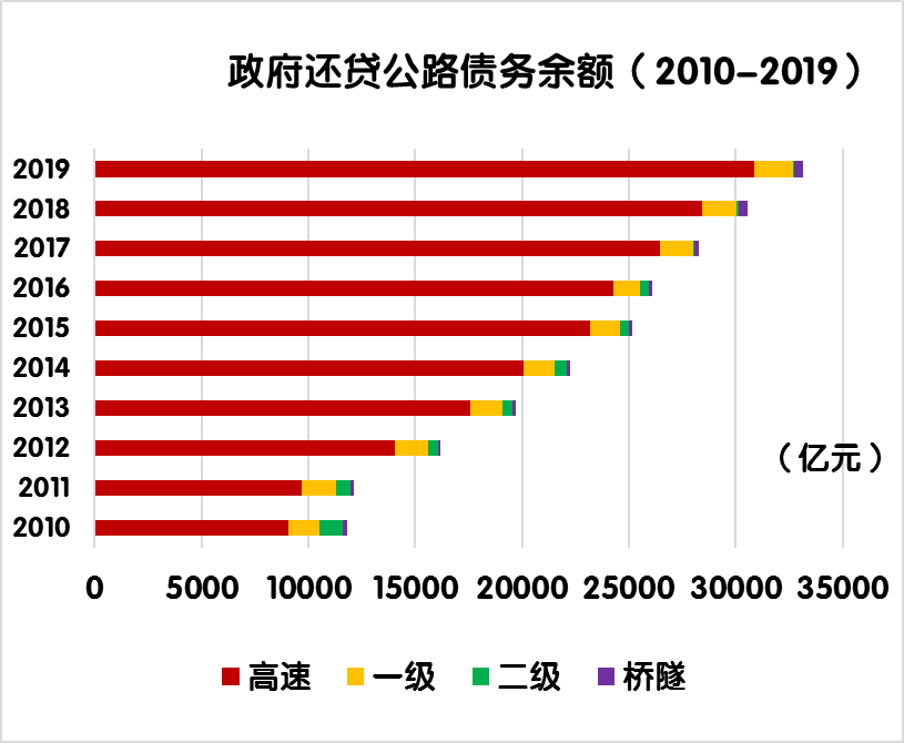與上年末相比,政府還貸公路債務(wù)余額由30536.1 億元增加到33147.7億元,凈增 2611.6億元,增長8.6%。其中,政府還貸高速公路債務(wù)余額由28420.3 億元增加到30889.7 億元,凈增2469.4 億元,增長8.7%。