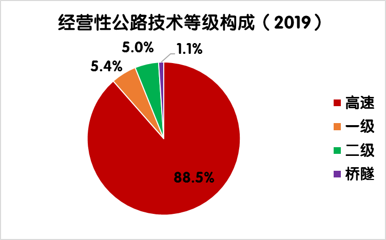 2019年末,全國經(jīng)營性公路里程7.72萬公里,占全國收費公路里程的45.1%。其中,經(jīng)營性高速公路6.84萬公里,一級公路0.41萬公里,二級公路0.39萬公里,獨立橋梁及隧道839公里,分別占經(jīng)營性公路里程的88.5%、5.4%、5.0%和1.1%。經(jīng)營性高速公路占收費高速公路里程的47.9%。