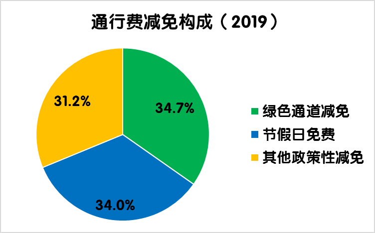 2019年度,全國收費公路共減免車輛通行費1009.7億元,占2019年度應(yīng)收通行費總額的14.5%,比上年增加91.9億元,增長10%。其中,鮮活農(nóng)產(chǎn)品運輸“綠色通道”減免350.8億元,占全年通行費減免總金額的比例為34.7%,比上年增加5.8億元,增長1.7%;重大節(jié)假日免收小型客車通行費343.7億元,占全年通行費減免總金額的比例為34.0%,比上年增加35.7億元,增長11.6%;高速公路差異化收費、ETC通行費優(yōu)惠、搶險救災(zāi)車輛免費等其他政策性減免315.3億元,占全年通行費減免總金額的比例為31.2%。比上年增加50.4億元,增長19%。