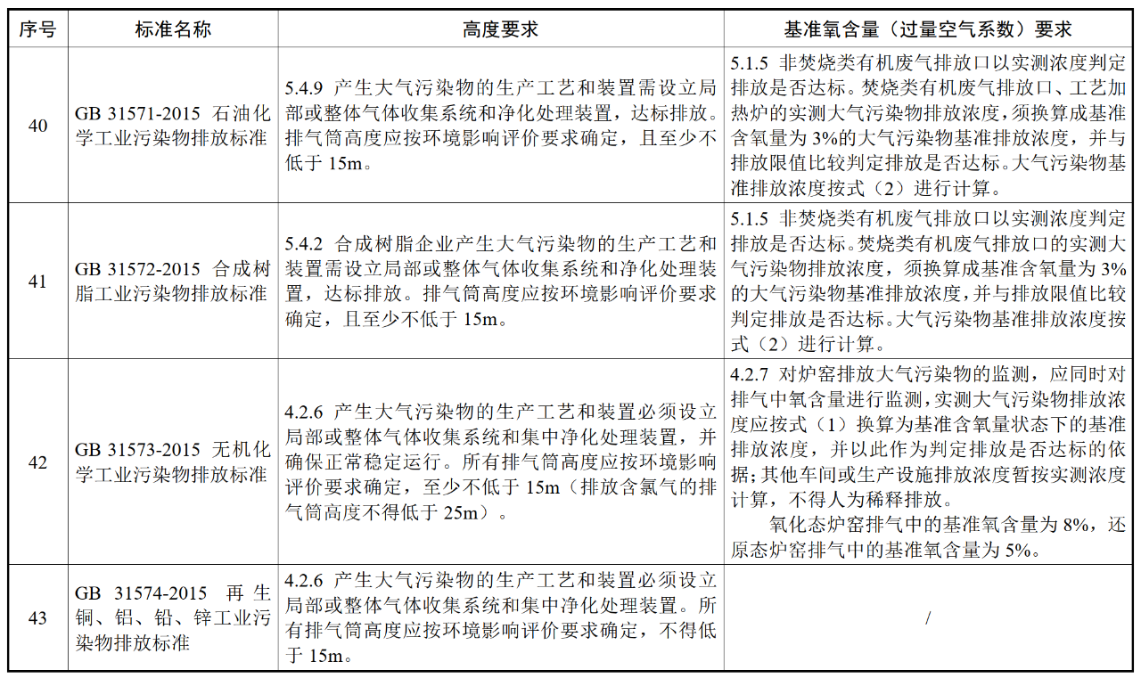 各行業大氣污染物(含VOCs)排氣筒高度及基準氧含量要求