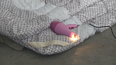 為了查證這個靠近起火點位置的斷頭線路究竟是哪種電器,火調(diào)員通過水洗篩選的辦法,在起火點附近的燃燒殘留物中發(fā)現(xiàn)了部分線路和一個金屬片,經(jīng)比對,該金屬片是電吹風(fēng)上用于固定電阻絲的“云母片”。