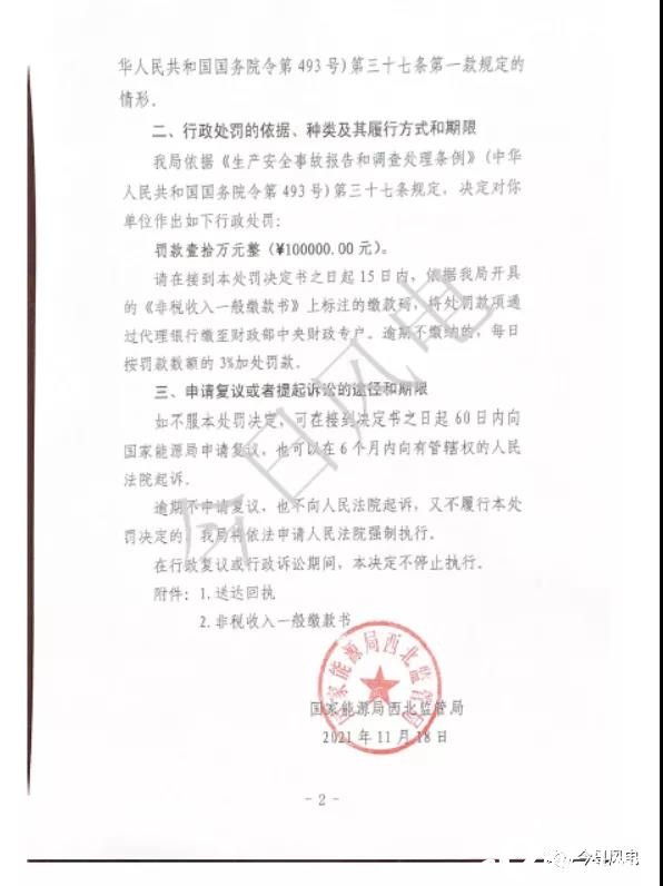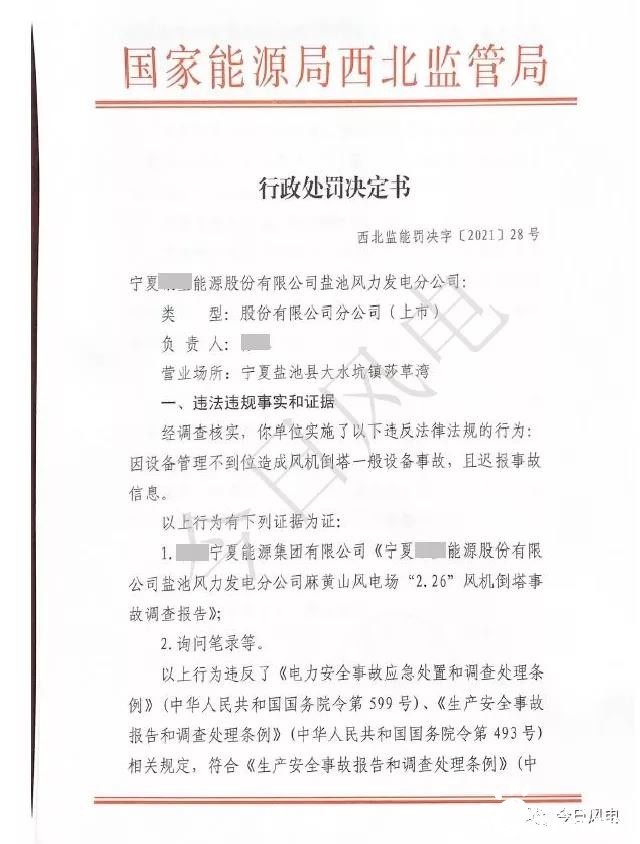近日,國家能源局西北監管局發布【2021】28號行政處罰決定書,根據該處罰決定,因設備管理不到位造成風機倒塔一般設備事故,且遲報事故信息,根據《生產安全事故報告和調查處理條例》(中國人民共和國國務院令493號)第三十七條規定,對寧夏銀星能源股份有限公司鹽池風力發電分公司罰款10萬元。