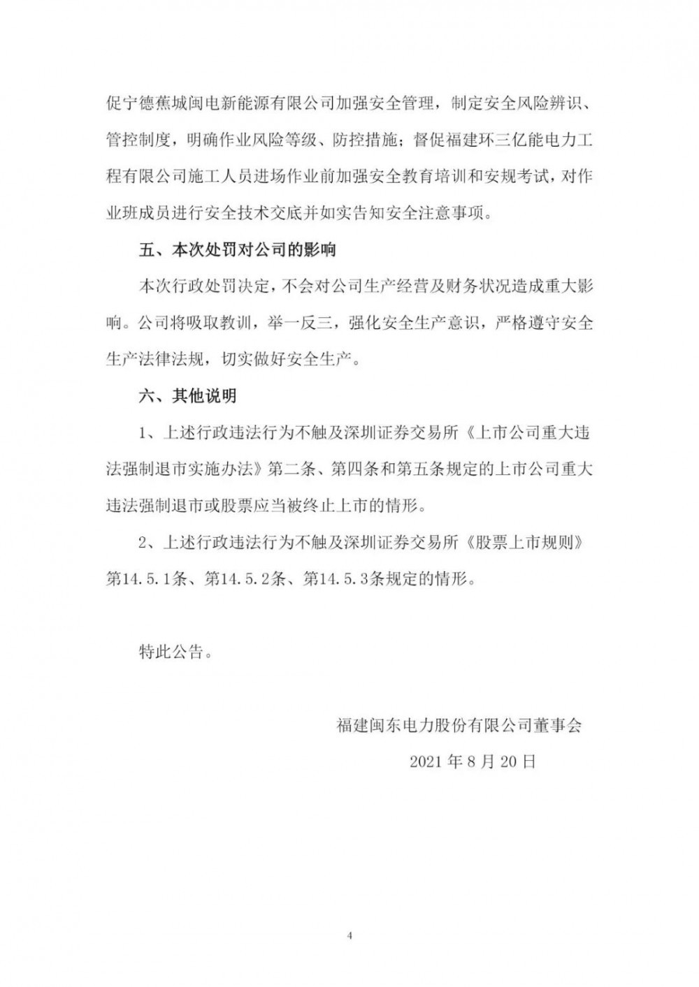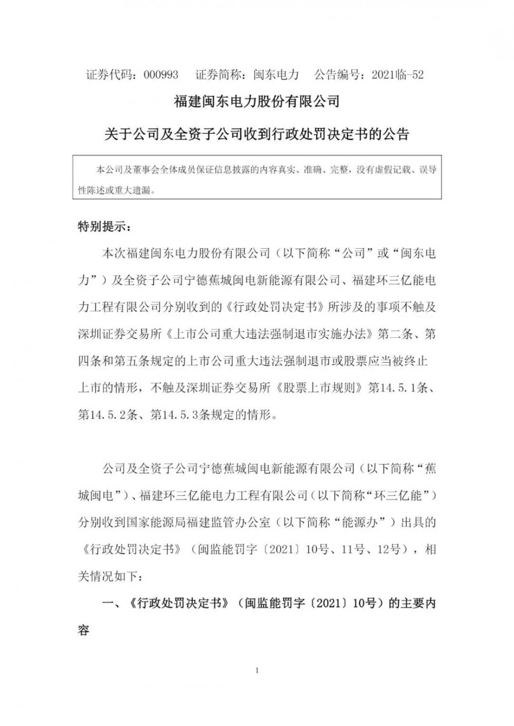 近日,福建閩東電力股份有限公司(以下簡(jiǎn)稱“閩東電力”)向社會(huì)公眾披露了《關(guān)于公司及全資子公司收到行政處罰決定書的公告》,閩東電力及旗下全資子公司寧德蕉城閩電新能源有限責(zé)任公司(以下簡(jiǎn)稱“蕉城閩電”)、福建環(huán)三億能電力工程有限公司(以下簡(jiǎn)稱“環(huán)三億能”)分別收到國(guó)家能源局福建監(jiān)管辦公室簽發(fā)的《行政處罰決定書》。