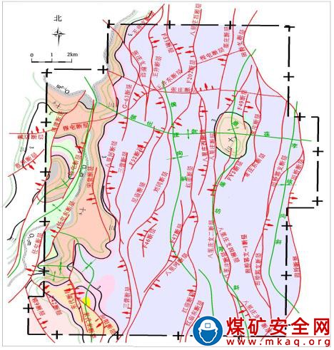 山東龍鄆煤業(yè)有限公司前身為山東省鄆城煤礦,位于菏澤市鄆城縣潘渡鎮(zhèn)境內,南距鄆城縣城 6 千米。原隸屬于山東省齊魯新航集團有限責任公司,2006 年 9 月開工建設。2011 年 1 月起,山東省鄆城煤礦由龍礦集團托管。2016 年 6 月,龍礦集團與山東省齊魯新航集團有限責任公司簽訂了《山東省鄆城煤礦移交接管劃轉協議》,礦井的生產建設主體變更為龍礦集團。2017 年 4 月,礦井正式投產,設計生產能力 240 萬噸/年。2017 年 12 月,礦井更名為山東龍鄆煤業(yè)有限公司(以下簡稱龍鄆煤礦)。2017 年 5~12 月,生產原煤 160 萬噸;2018 年 1~9 月,生產原煤 177.73萬噸。礦井采礦許可證、安全生產許可證、工商營業(yè)執(zhí)照齊全有效。礦井開采條件。井田位于巨野煤田最北端,屬全隱蔽的華北型石炭、二疊系煤田。井田范圍由 20 個拐點坐標圈定,面積 198.3 平方公里,開采標高-450~-1750 米。井田含煤地層為山西組和太原組,其中主采煤層為山西組 3 煤層。井田處于鄆城斷裂、巨野斷裂、曹縣斷裂和汶泗斷裂的“井”字形中間區(qū)內,井田的典型構造特征為斷塊型。井田總體呈走向近南北、傾向東的單斜構造,勘查發(fā)現全井田共有斷層 130 條,其中,一采區(qū) 37 條。見圖 1。