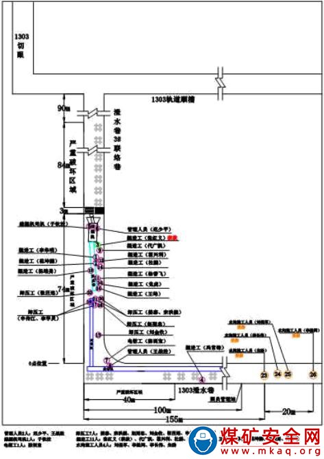 掘二隊 7 人正在距離拐點 155 米以外砌筑水溝,當班驗收員夏付人也在這個位置,沖擊氣浪將其安全帽沖掉。發(fā)生事故后,夏付人和其他 7 人一起往外撤。