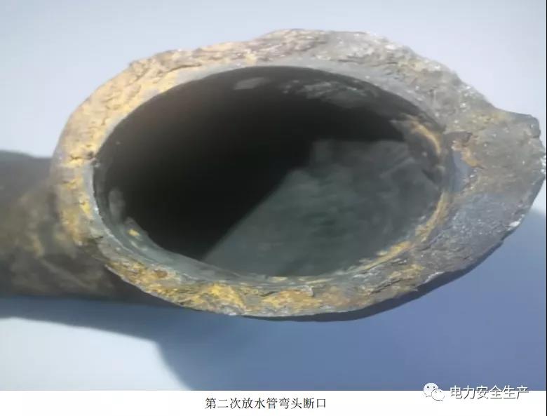8.8 月 10 日第一次發現放水管泄漏,漏點為線狀裂紋,在焊口上部管座側的熱影響區,距離焊口約2mm 母材處,長度約3 至 5mm。9 月 14 日帶壓堵漏過程中,在該裂紋位置發生斷裂爆開。對爆口斷面進行分析,斷面為環形,焊口無損傷,對斷裂爆口、管座、焊縫,以及相連彎頭、直管段材質光譜定性分析,材質與20G 相符(見附件 9)。分析裂紋產生原因為放水管焊口熱影響區剛性較大,彎頭與管座對接接頭的管座側熱影響區位置應力集中,產生金屬疲勞出現裂紋,發生泄漏。