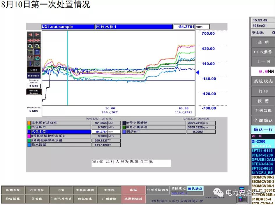 15:22 分,鍋爐給煤量由204t/h 減至 49t/h,汽包水位由-32mm快速降至-188mm。