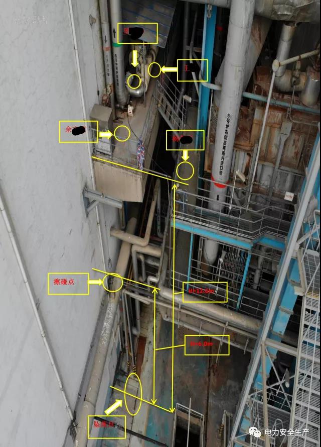 4.現場核查,主給水放水管已完全斷裂,下部水泥平臺被擊穿,臨近的滑動支架被高壓水汽吹脫至靠汽機房墻面,注膠槍與夾具脫開,吹至靠汽機房墻面。給水平臺頂端下部懸空冷再供熱母管保溫外護板有明顯碰撞變形痕跡,和余某某事故中躲避位置、事故后墜落位置對應。