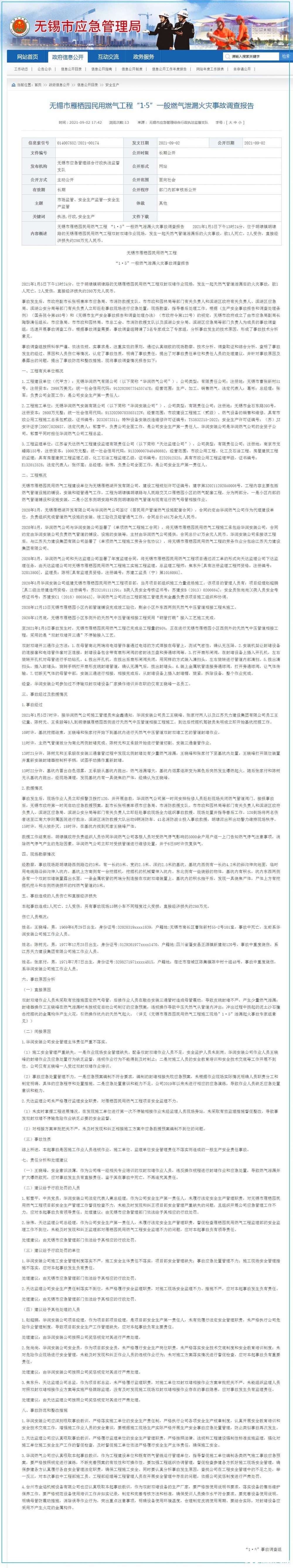 9月2日,無錫市應急管理局網站公布無錫市雁棲園民用燃氣工程“1·5”一般燃氣泄漏火災事故調查報告。報告顯示,2021年1月5日下午13時24分,位于胡埭鎮(zhèn)胡埭路的無錫雁棲園民用燃氣工程雙封雙堵作業(yè)現場,發(fā)生一起天然氣管道泄漏后的火災事故,致1人死亡,2人受傷,直接經濟損失約280萬元人民幣。本起事故是因施工作業(yè)人員違規(guī)作業(yè),施工單位、監(jiān)理單位安全管理責任不落實而造成的一般生產安全責任事故。
