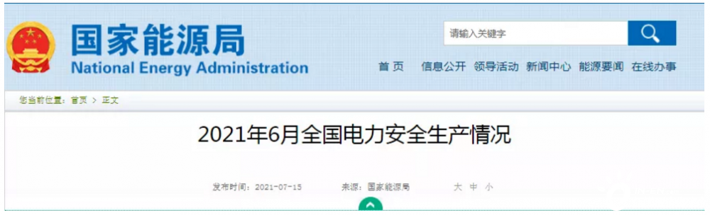 2021年6月份,全國發生電力人身傷亡事故2起、死亡2人,同比事故起數減少3起、死亡人數減少5人。其中,發生電力生產人身傷亡事故2起、死亡2人,同比事故起數減少2起、死亡人數減少4人;未發生電力建設人身傷亡事故,同比事故起數減少1起、死亡人數減少1人。未發生電力安全事故,同比持平。未發生直接經濟損失100萬元以上的電力設備事故,同比持平。發生2起電力安全事件,同比增加1起。